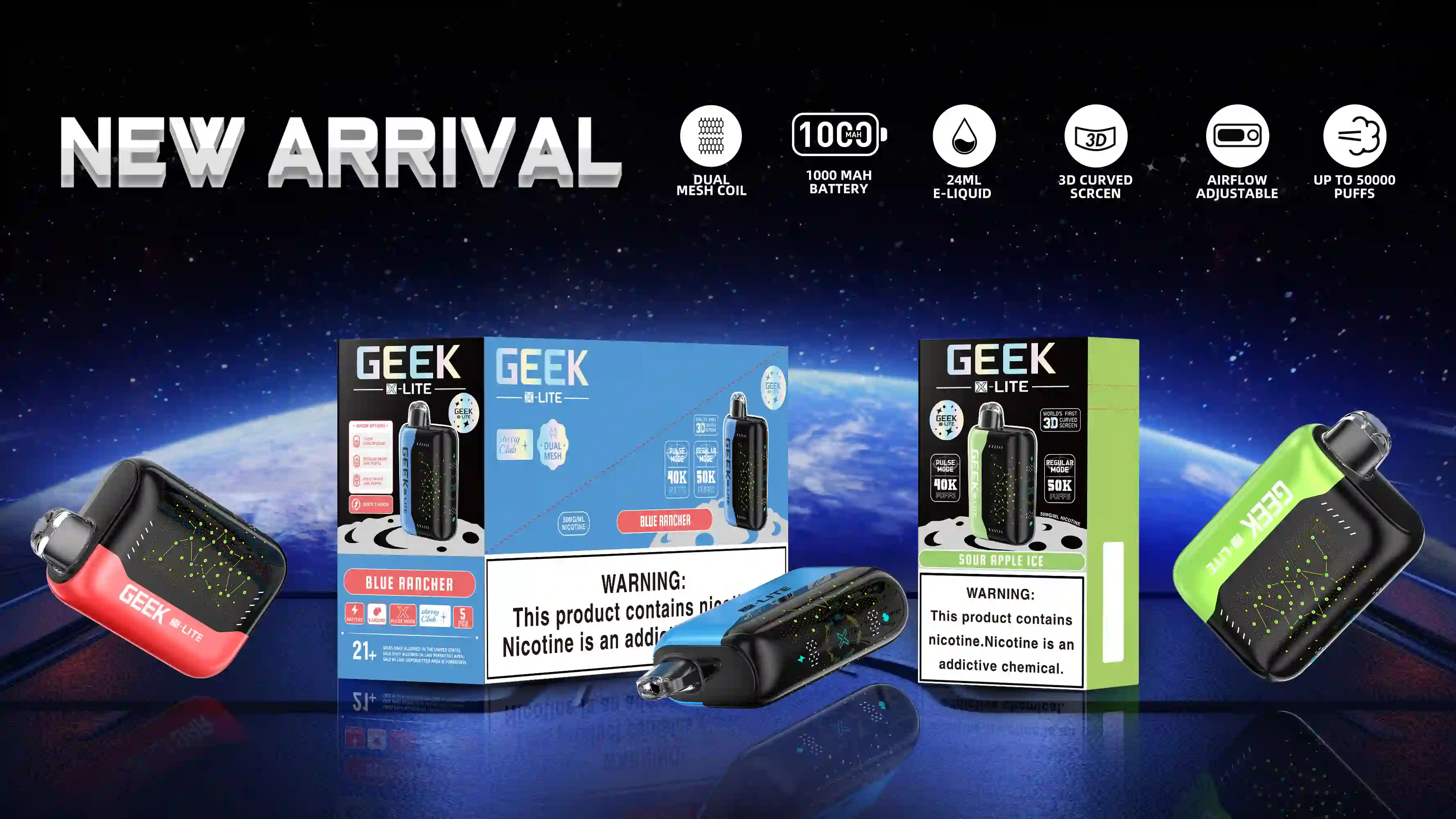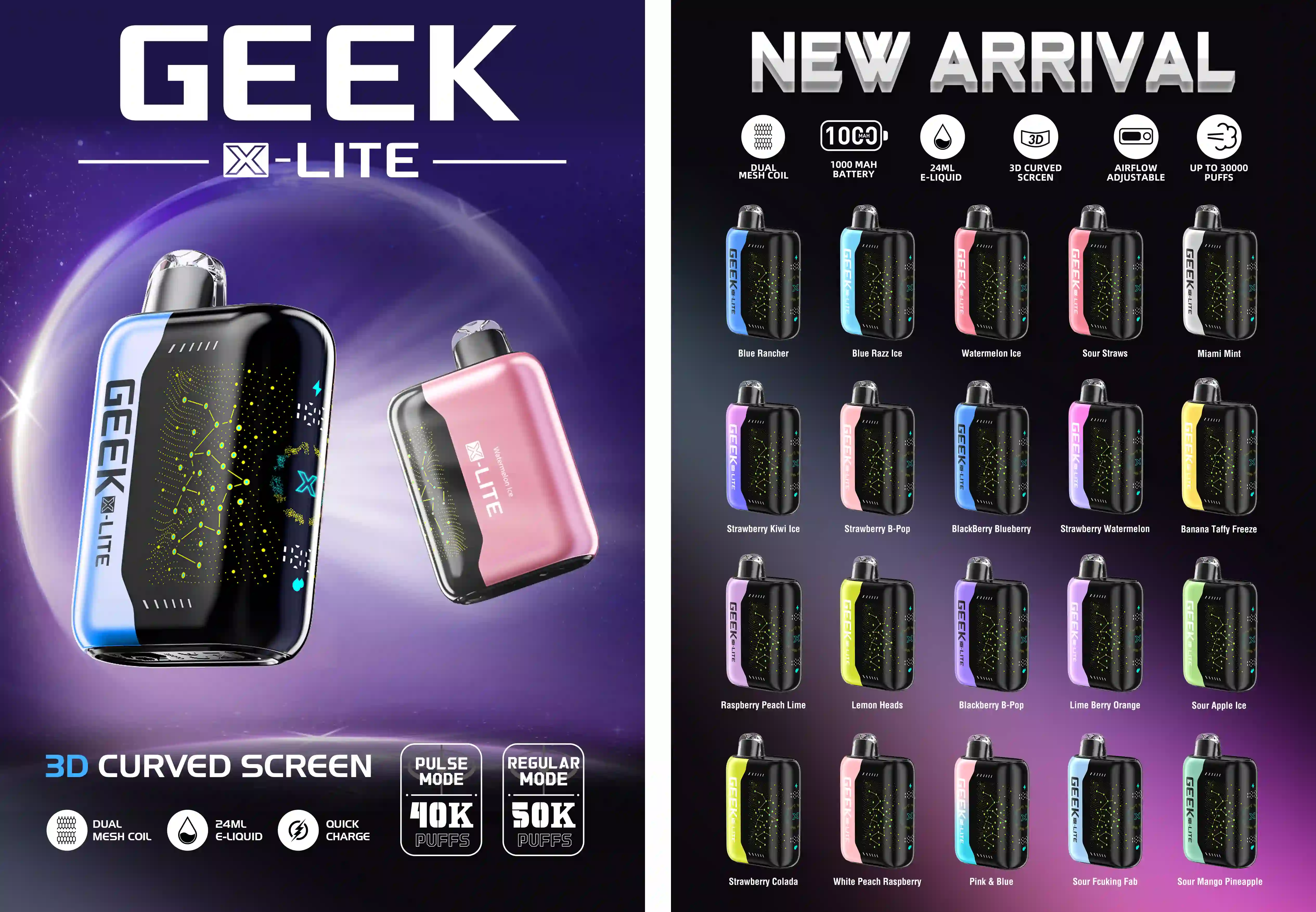 Step into the next generation of vaping with the Geek X-Lite 50K Puffs Disposable Vape, a bold evolution of the iconic Geek Bar Pulse X and Geek Bar X lines. This powerhouse combines futuristic looks with performance that hits hard — from its Dual Mesh Coil and 1000mAh battery to the 24ml e-liquid capacity, 3D curved screen, and adjustable airflow system. It’s built for vapers who want massive clouds, vibrant taste, and serious style.